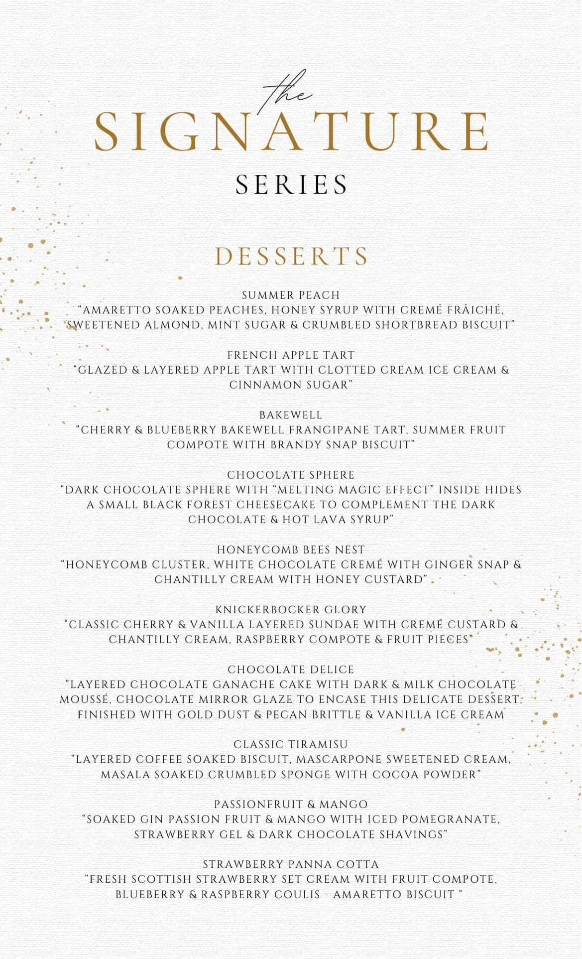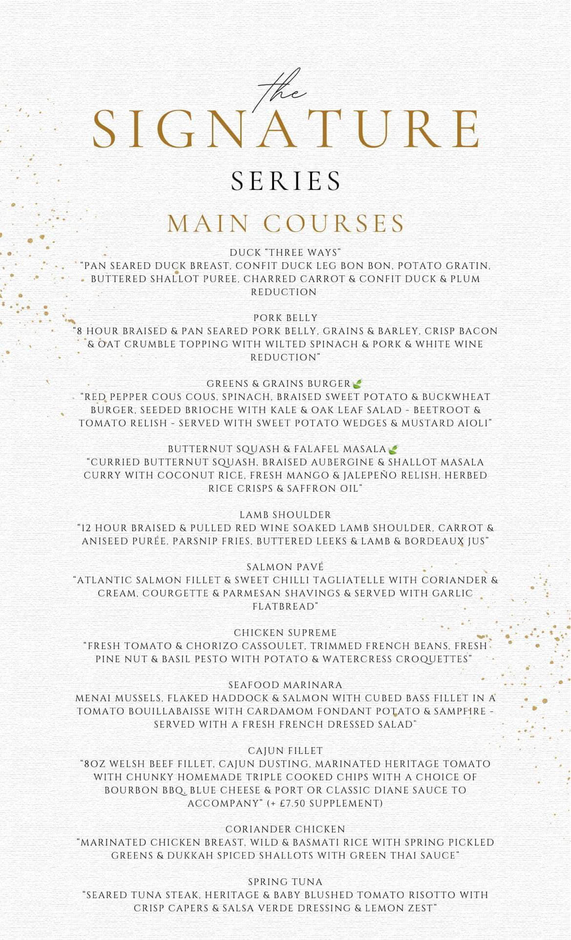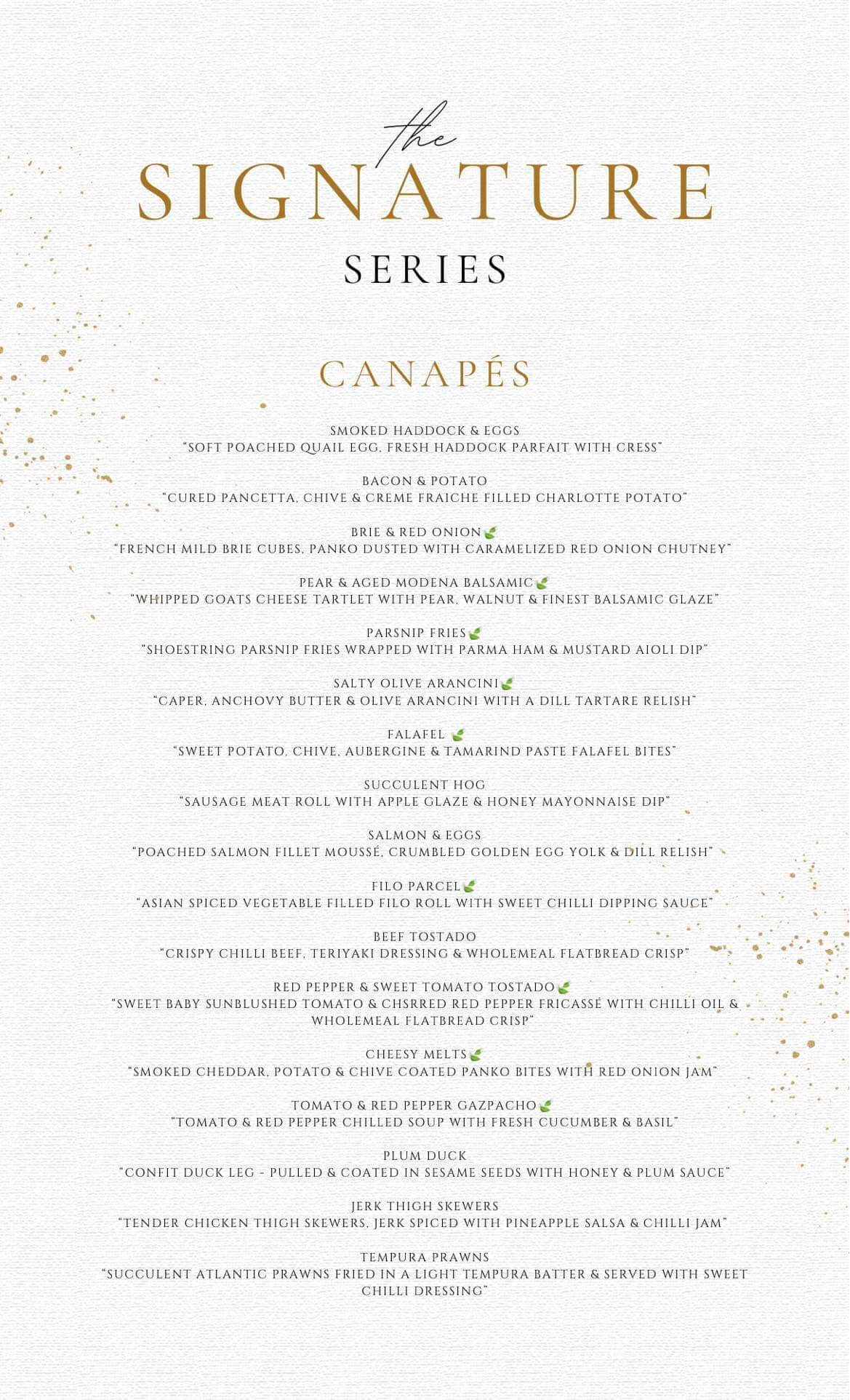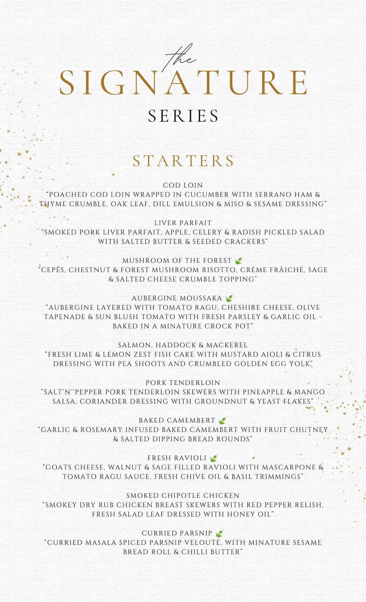 Elevate your dinner party to a new level of sophistication with our ‘Signature Series’ catering menu, We also offer specialised menus for vegetarians, vegans, and children.
